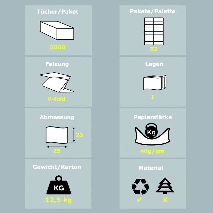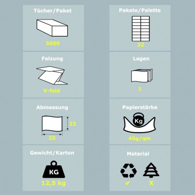 Dieses einlagige grüne Falthandtuch ist sehr gut geeignet zum Reinigen von Arbeitsflächen sowie zum Händetrocknen. Passend für alle gängigen ZZ / V Fold Handtuchspender, Tuchgröße 25x23, Papierstärke 1x40g/qm, Farbe grau, Material recycling, V-ZZ Falzung, 1-lagig, 5000 Tücher pro Karton, 32 Kartons pro Palette, Mindestabnahmemenge 1 Palette sortenrein