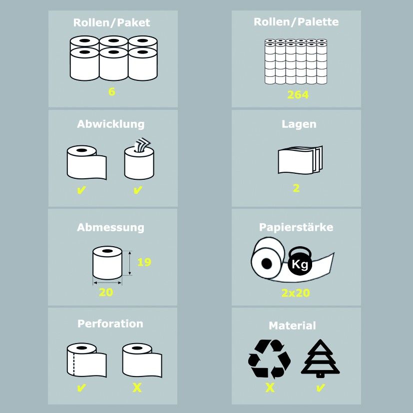 Diese zweilagige Handtuchrolle mit sehr hohem Weißegrad verfügt über eine hohe Reißfestigkeit durch 100% Celluloseanteil und zwei Lagen. Papierrolle hochweiß, Innen-und Außenabrollung möglich, Spiralkern 6cm, 2-lagig, ca. 82% Weißgrad, Material 100% Zellstoff, Papierstärke ca. 2x19g/qm, Durchm. ca. 20cm, Breite ca. 19,5cm, ca. 1,1kg, leichte Perforation, 6 Rollen in Folie gepackt, 264 Rollen pro Palette, Mindestabnahmemenge 1 Palette sortenrein