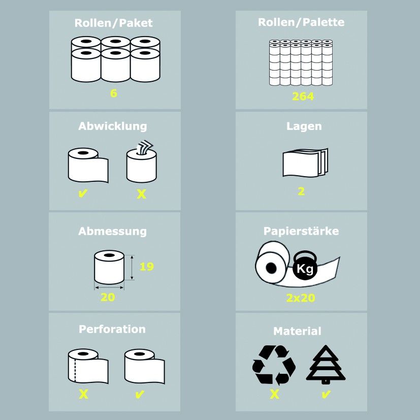 Diese zweilagige Handtuchrolle mit sehr hohem Weißegrad verfügt über eine gute Reißfestigkeit durch 100% Cellulose und zwei Lagen. Mit ihrem festen 4cm Kern ist sie geeignet für viele gängige Automatikspender. Papierrolle hochweiß, nur für Außenabrollung, fester Kern 4cm, 2-lagig, ca. 82% Weißgrad, Material 100% Zellstoff, Papierstärke ca. 2x19g/qm, Durchm. ca. 19,5cm, Breite ca. 19,5cm, ca. 1,1kg, keine Perforation, 6 Rollen in Folie gepackt, 264 Rollen pro Palette, Mindestabnahmemenge 1 Palette sortenrein