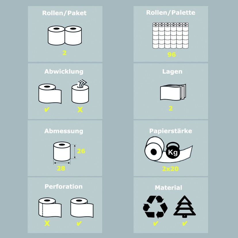 Diese zweilagige Handtuchrolle im Jumboformat ist überall dort gefragt wo große Mengen Papier nötig sind, wie z.B. in Werkstatt oder Industrie. Papierrolle Jumbo, Außenabrollung, fester Kern 6cm, 2-lagig, Farbe weiß , Material Zellstoff 100%, Papierstärke ca. 2x17g/qm, Durchmesser ca. 28cm, Breite ca. 26cm, ca. 2,5kg, ohne Perforation, 2 Rollen in Folie verpackt, 96 Rollen (48 Kartons) pro Palette, Mindestabnahmemenge 1 Palette sortenrein